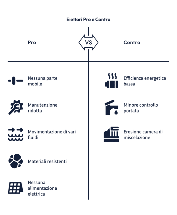 - Gli eiettori possono risultare meno efficienti rispetto alle pompe, soprattutto se il fluido motore è generato appositamente per il loro funzionamento. Tuttavia, quando si utilizza un fluido di scarto (vapore o gas in pressione), il consumo energetico è praticamente nullo.
